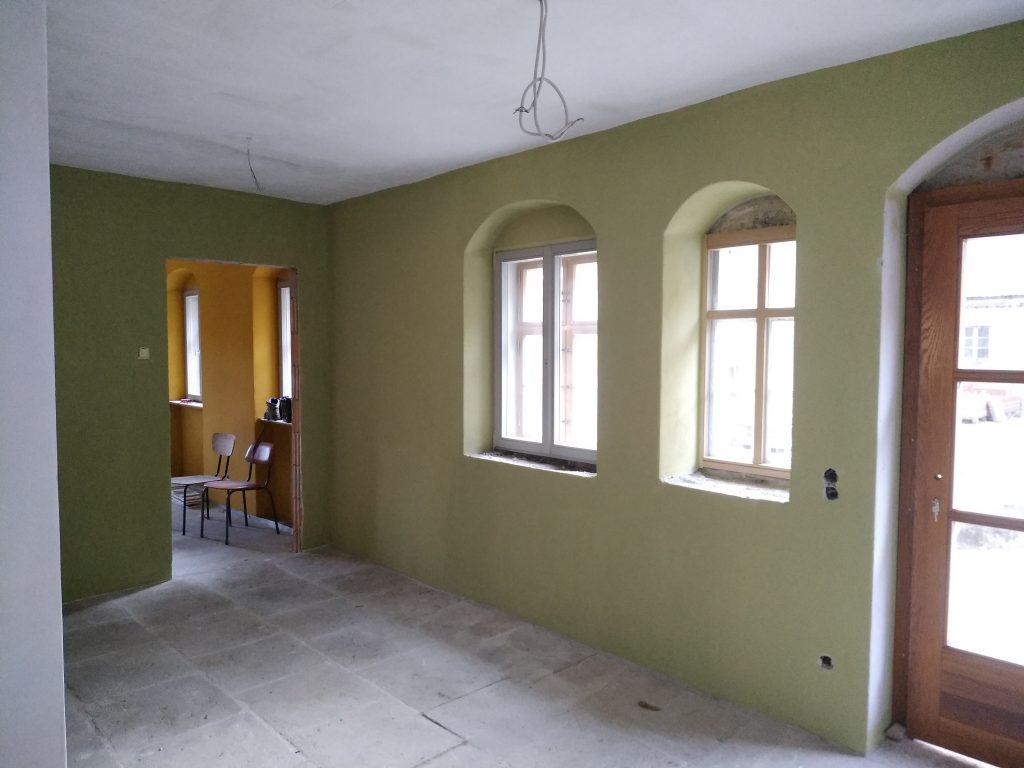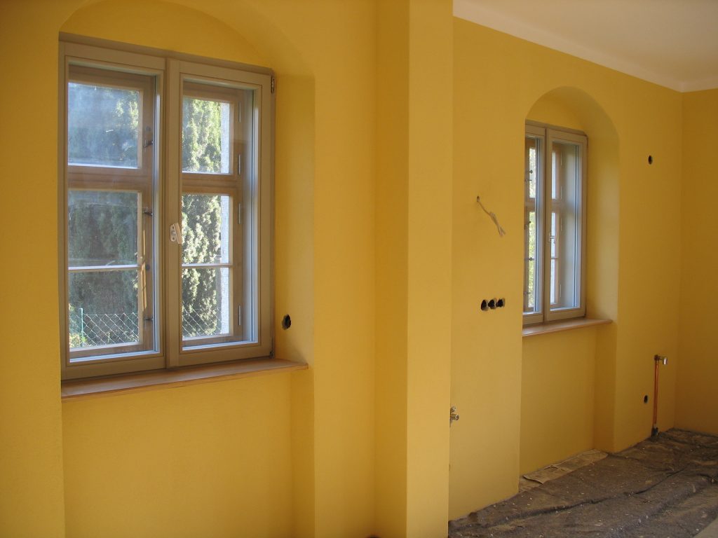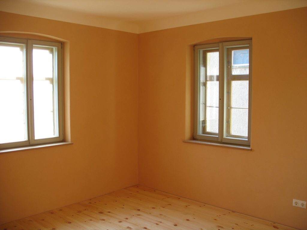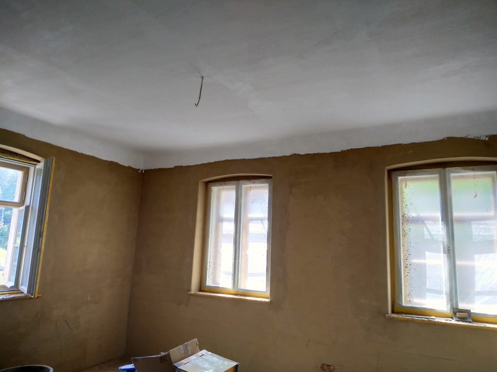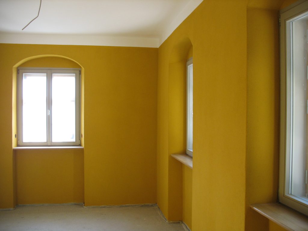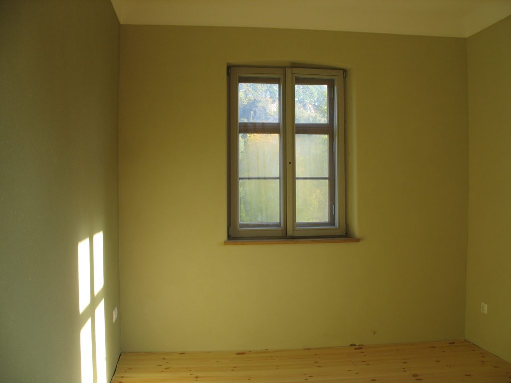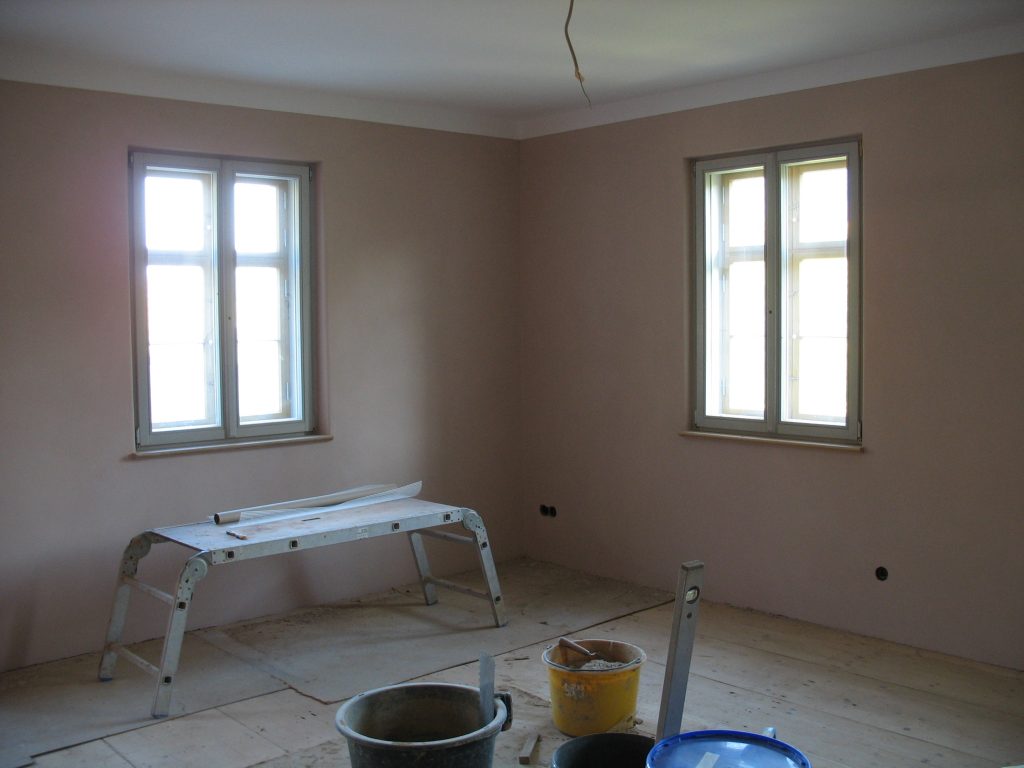 Die Innenwände erhielten Lehmputz, die Decken sollten ihren alten Charakter behalten, doch deren Risse dauerhaft verschwinden. Diese Decken stabilisierte ich nach umfangreicher Vorbehandlung durch eingespachtelten Glasvlies, alles auf mineralischer Basis. Die Anstriche der Decken und Wände wurden ebenfalls mit silikatbasierten Anstrichstoffen ausgeführt (Keim Biosil, Keim Optil), doch auch mit getöntem Lehmputz.