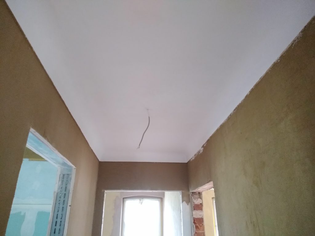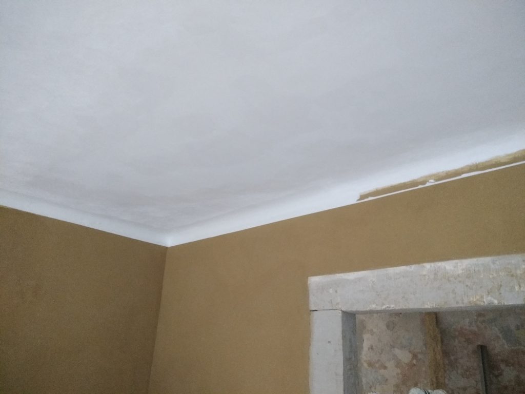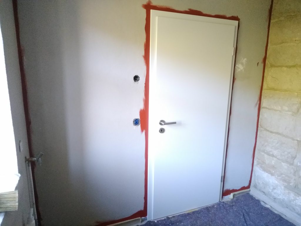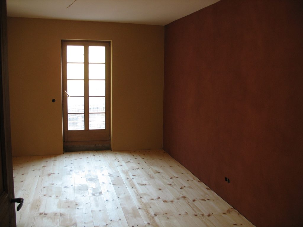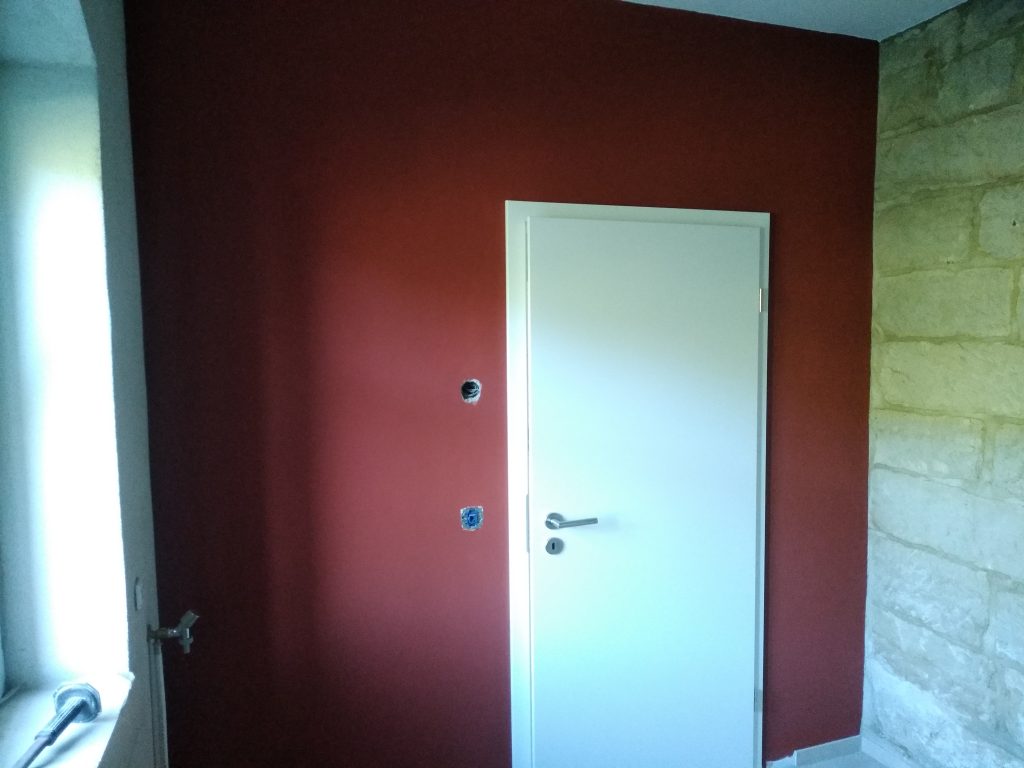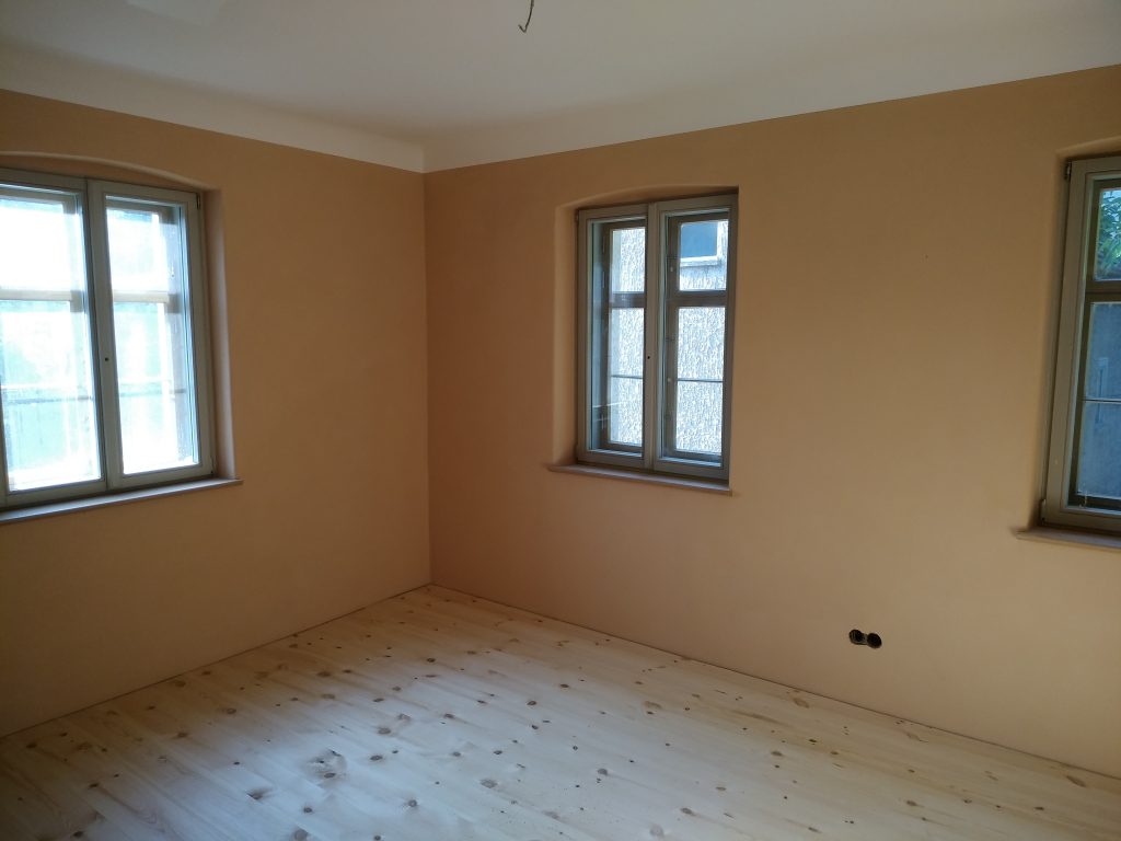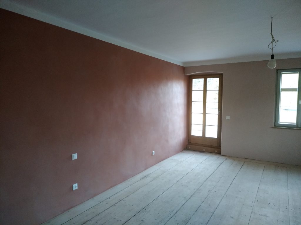 Die Innenwände erhielten Lehmputz, die Decken sollten ihren alten Charakter behalten, doch deren Risse dauerhaft verschwinden. Diese Decken stabilisierte ich nach umfangreicher Vorbehandlung durch eingespachtelten Glasvlies, alles auf mineralischer Basis. Die Anstriche der Decken und Wände wurden ebenfalls mit silikatbasierten Anstrichstoffen ausgeführt (Keim Biosil, Keim Optil), doch auch mit getöntem Lehmputz.