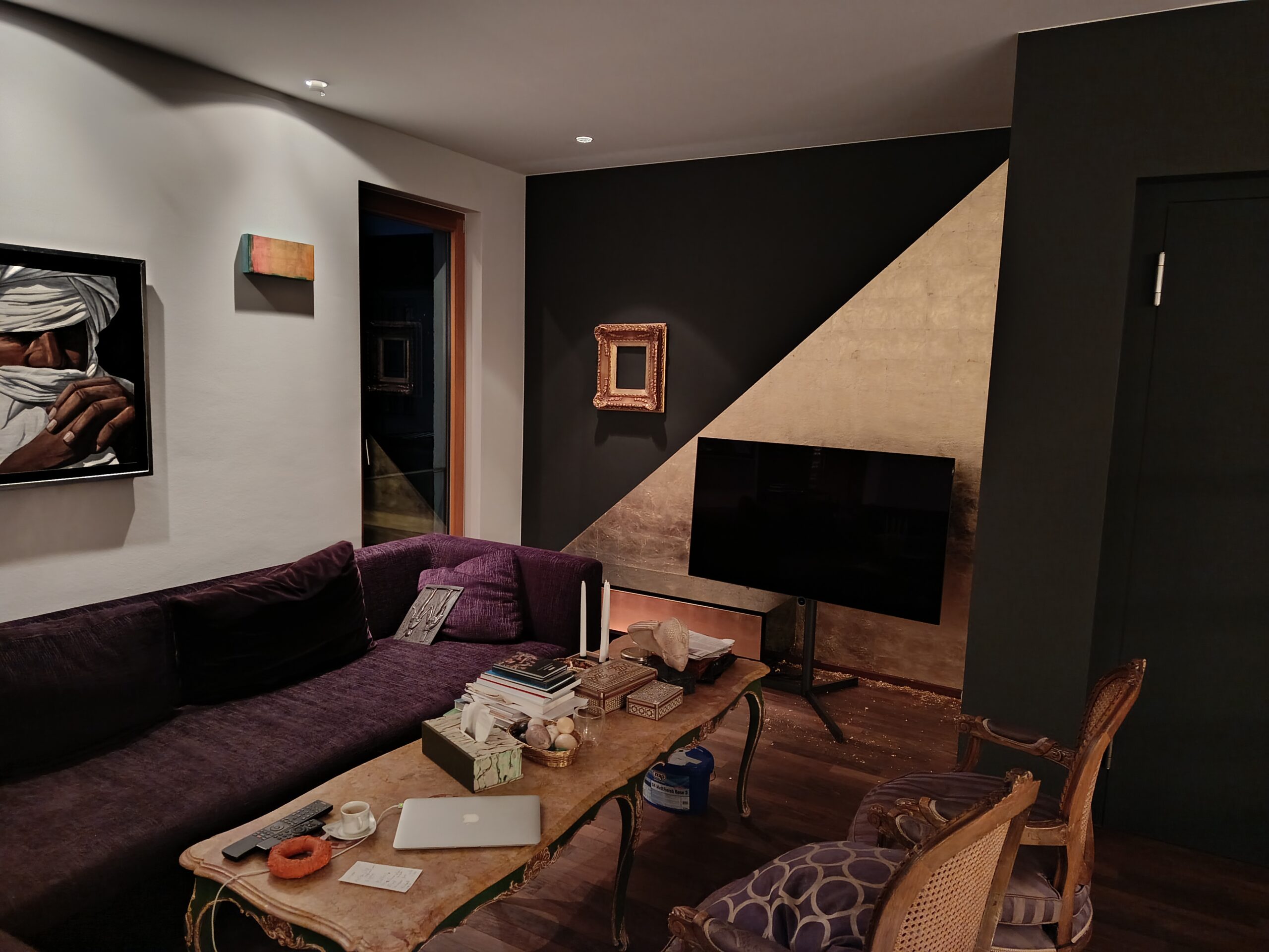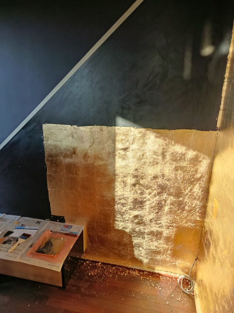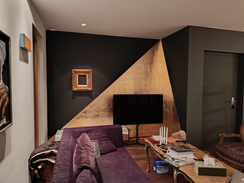 Hier das vorläufige Krönchen des Auftrages: eine Pyramide aus Blattgold. Nicht aalglatt, sondern nach Wunsch lebhaft aufgetragen, vorher die betreffende Wand in Anthrazit (ZERO Q4) gestrichen:
